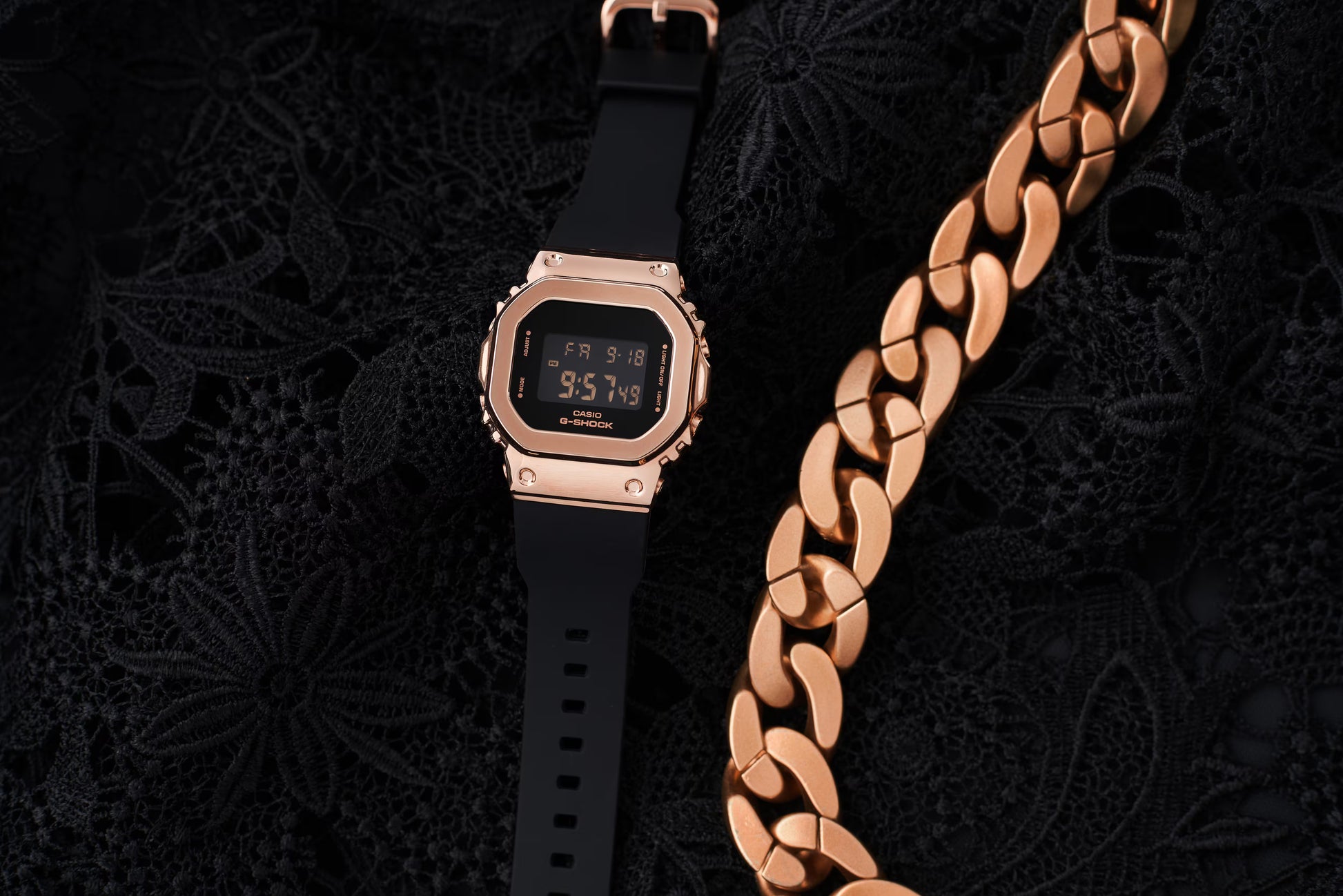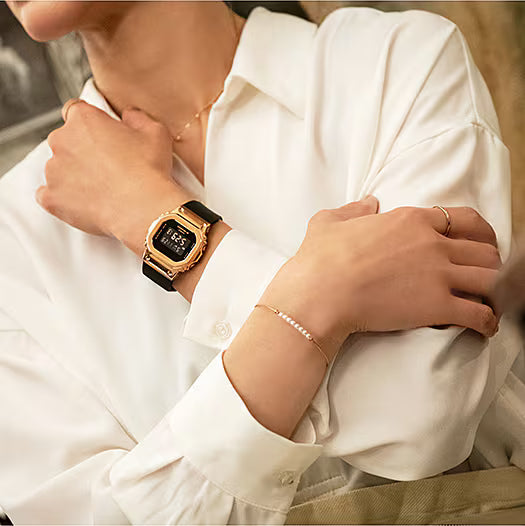 A down-sized model of the iconic 5600 series with a metal finish. The square design of the GM-5600, which has been used since the first model, has been downsized to achieve a lightweight and comfortable fit. The bezel cover is made of metal with pink gold ion plating, and the band is an elegant G-SHOCK band in black.